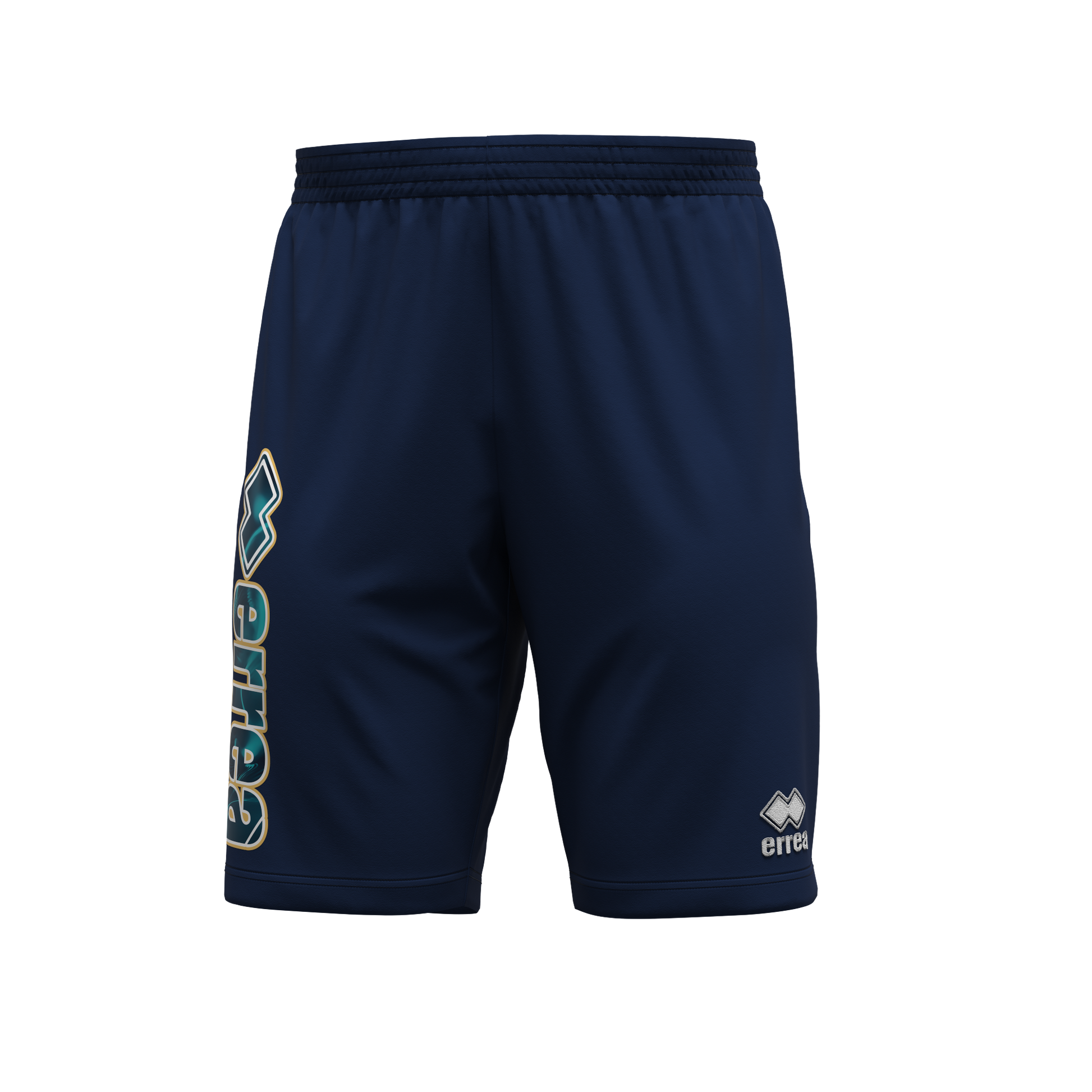Design Unico: Il pantaloncino è impreziosito da una scritta Errea sagomata azzurra e blu lungo la coscia con dietro piccolissimi stemmi che richiamano il logo Chieri 76.